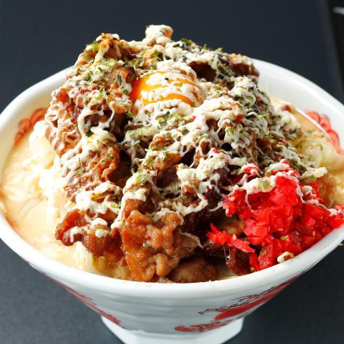 焼き肉ダレの肉に、生卵とマヨネーズでまろやかになり、梅紅生姜の爽やかな酸味が最後まで味を飽きさせない。