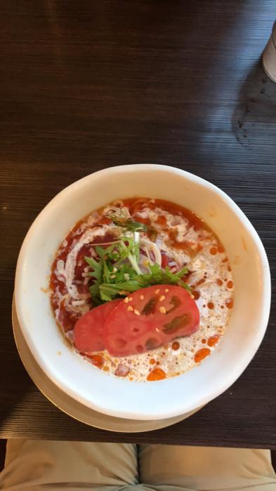 ナッツ・トマト・水菜・白髪葱・肉味噌が麺に絡み、クリーミなゴマ坦々味噌スープとトマトの酸味が相性バツグン。