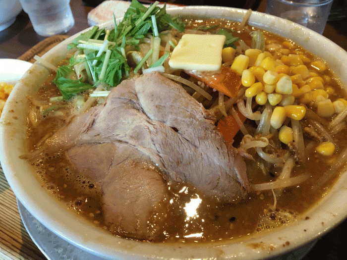 トッピングはバターを選択。たっぷりの野菜の下にはコシのある太麺が。中盛り無料なのも嬉しかったです。ボリュームに大変満足できる、おすすめのラーメンです。